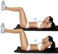 Exercício Abdominal: Abdome: Para ter uma barriga sarada. Deitada de barriga para cima, pernas flexionadas. Eleve o tronco contraindo o abdome e desça até a metade, sem relaxar. Inspire embaixo e solte o ar quando sobe. Faça 5 séries de 30 repetições.